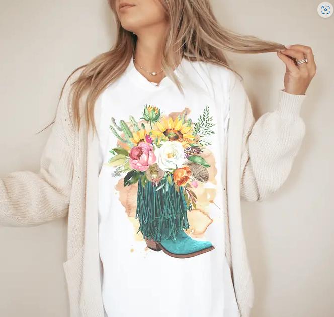 Get your western style on with these Cowboy boot flowers sublimation tees for women.
